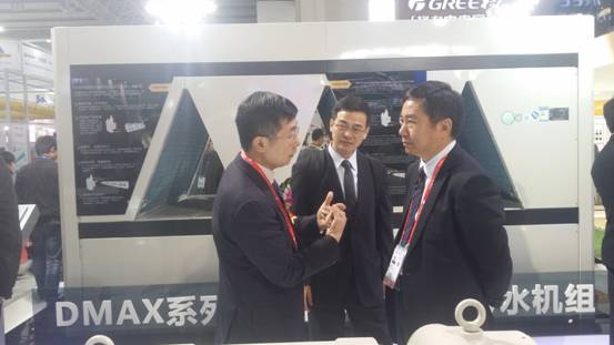 制冷展上,中國制冷空調(diào)工業(yè)協(xié)會秘書長張朝暉(右一)與格力總工程師展開技術(shù)交流