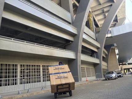 圖為巴西工人在場館內(nèi)安裝調(diào)試格力空調(diào)